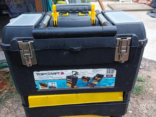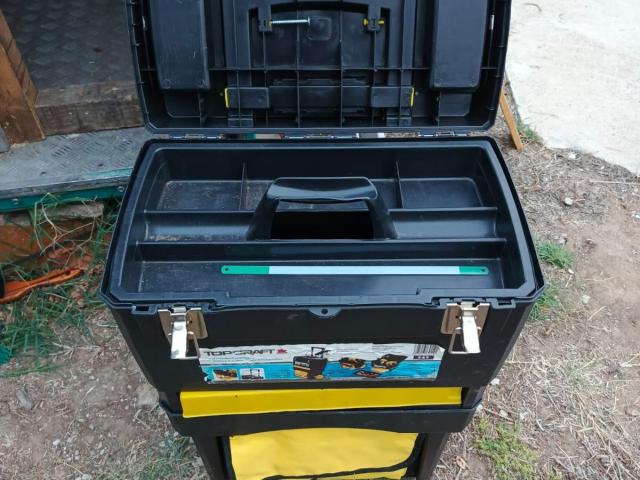 Нова чанта за инструменти. Има две кутии, малка чантичка и изтегляща се полица. Компактна, вместима, на колела. От дясната страна липсва закопчалка. Произведено в Германия.